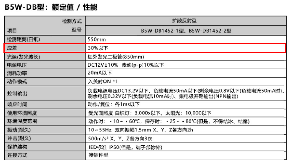 反射型光電傳感器上的動(dòng)作距離是指使檢測(cè)物體接近傳感器時(shí)切換為ON的距離。此外,使檢測(cè)物體離開(kāi)該范圍并切換為OFF的距離稱為復(fù)位距離。這個(gè)動(dòng)作距離與復(fù)位距離之差稱為“應(yīng)差距離”(參考見(jiàn)下圖)。如果無(wú)應(yīng)差,則會(huì)在動(dòng)作區(qū)域附近出現(xiàn)反復(fù)切換ON/OFF的現(xiàn)象(震顫)。為了防止這種現(xiàn)象的發(fā)生,需要設(shè)定應(yīng)差。B5W-DB型的應(yīng)差規(guī)定在30%以下。例如,某單體以800mm的距離切換為ON時(shí),表示復(fù)位距離為800 mm X 1.3 =1,040 mm以下。