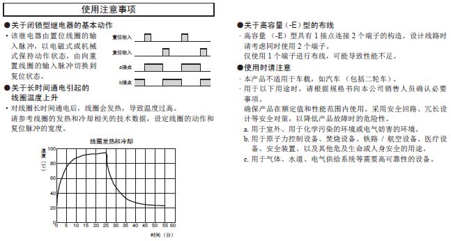 注:上述為初始值 *1.測量條件:根據(jù)電壓下降法,在DC5V?1A的條件下 *2.測量條件:在環(huán)境溫度23℃、施加額定線圈操作電壓的條件下。負載比:請在10%以下使用。 *3.測量條件:用DC500V絕緣電阻計測量與耐壓項目中相同的部位。 *3.在最小脈沖寬度30ms的條件下開關。 |