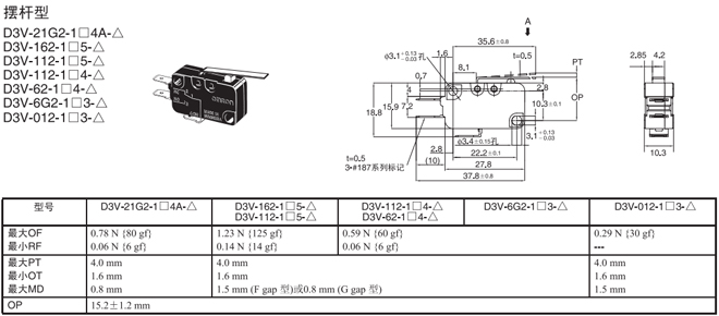 | 短擺桿型 | 內部安裝 | 1.23N {125gf} | D3V-21G1-1□4A-△ | D3V-21G1-2□4A-△ | D3V-21G1-3□4A-△ |