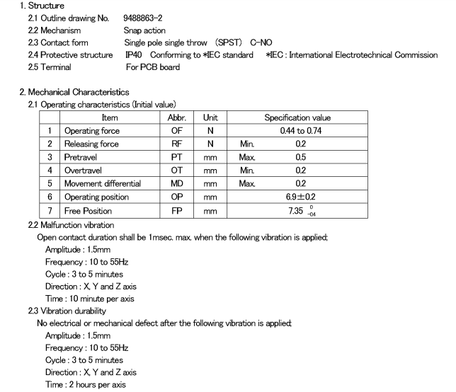 D2FC-F-7N (20M) 克力為:60+/-15G,壽命為2000萬次;