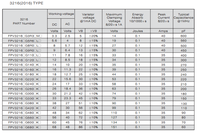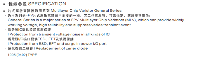 特征: 1、疊層片式陶瓷結(jié)構(gòu)。 2、無(wú)引線(xiàn)。 3、溫度范圍:-55℃~+125 ℃。 4、工作電壓范圍V w(dc)=3.3~ 615V。 5、具有雙向限制特性,適合ESD保護(hù)。 6、漏電流非常小。 7、寄生電感小、響應(yīng)速度快(響應(yīng)時(shí)間少于0.5ns)。 8、優(yōu)良的溫度系數(shù)。 9、良好的焊接性能(端電極為三層電鍍)。 應(yīng)用: 1、防止過(guò)電壓:當(dāng)施加的電壓升高到壓敏電壓時(shí),壓敏電阻器的電流急劇上升,被保護(hù)設(shè)備的浪涌電壓迅速減小,從而使裝有壓敏電阻器的設(shè)備抗浪涌噪聲能力達(dá)到相應(yīng)要求。壓敏