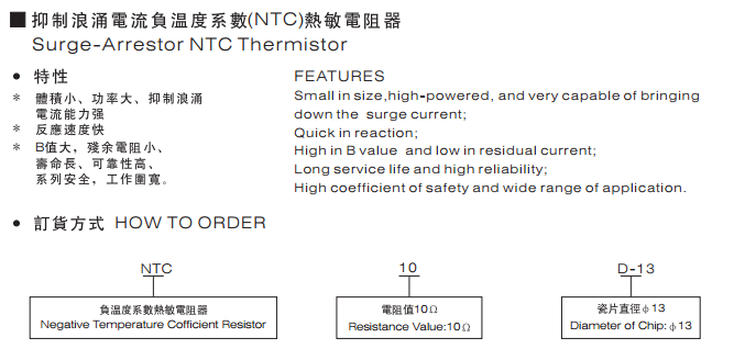 TC熱敏電阻器:是以錳、鈷、鎳和銅等金屬氧化物為主要材料,采用陶瓷工藝制造而成的。NTC熱敏電阻器在室溫下的變化范圍在10°歐姆~10⒍歐姆,溫度系數-2%~-6.5%。它具有電阻值隨溫度的上升而下降的特性。適用于轉換電源、開關電源、UPS電源、各類電加熱器、電子節能燈、電子鎮流器、各種電子裝置電源電路的保護以及彩色顯示管、白熾燈及其他照明燈具的燈絲保護。